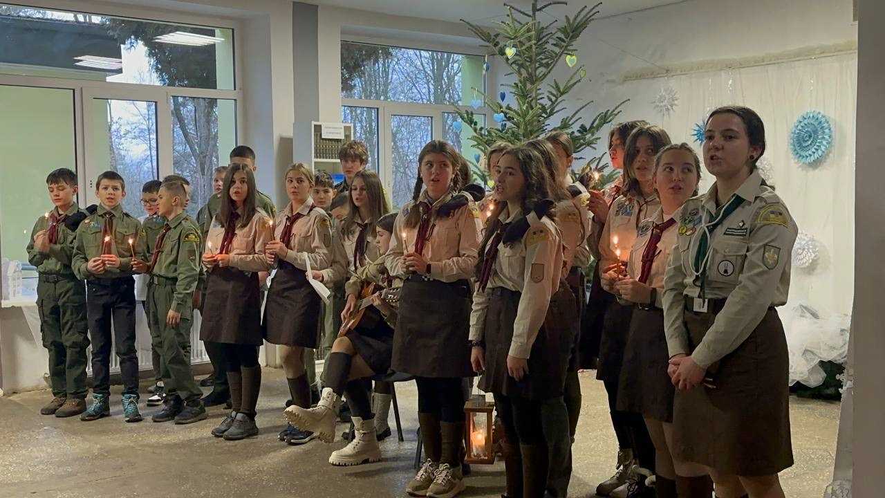 Пластуни станиці Пустомити урочисто передали Вифлеємський вогонь учнівській та педагогічній спільнотам Пустомитівського ліцею №1.