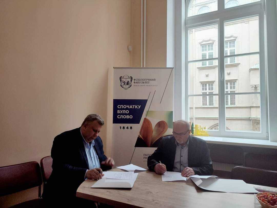Підписано договір про співпрацю між філологічним факультетом Львівського національного університету імені Івана Франка та Пустомитівським ліцеєм №2 імені Василя Кучабського в особі Романа Крохмального, декана філологічного факультету, та Ігоря Мадая, директора Пустомитівського ліцею №2, при сприянні Олеся Сколоздра-Шепітко, доцента кафедри української мови.