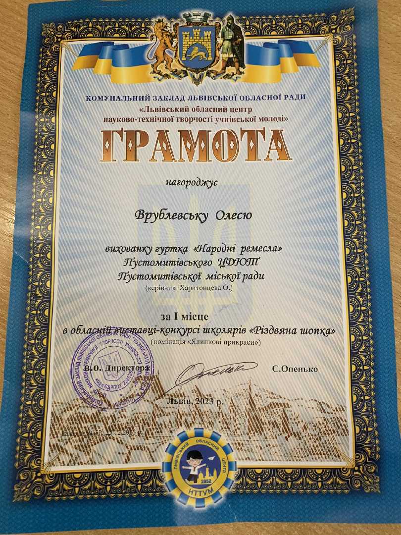 1 місце-Врублевська Олеся, вихованка гуртка «Народні ремесла» за виріб «Іграшки на ялинку» (керівник Харитонцева О.)