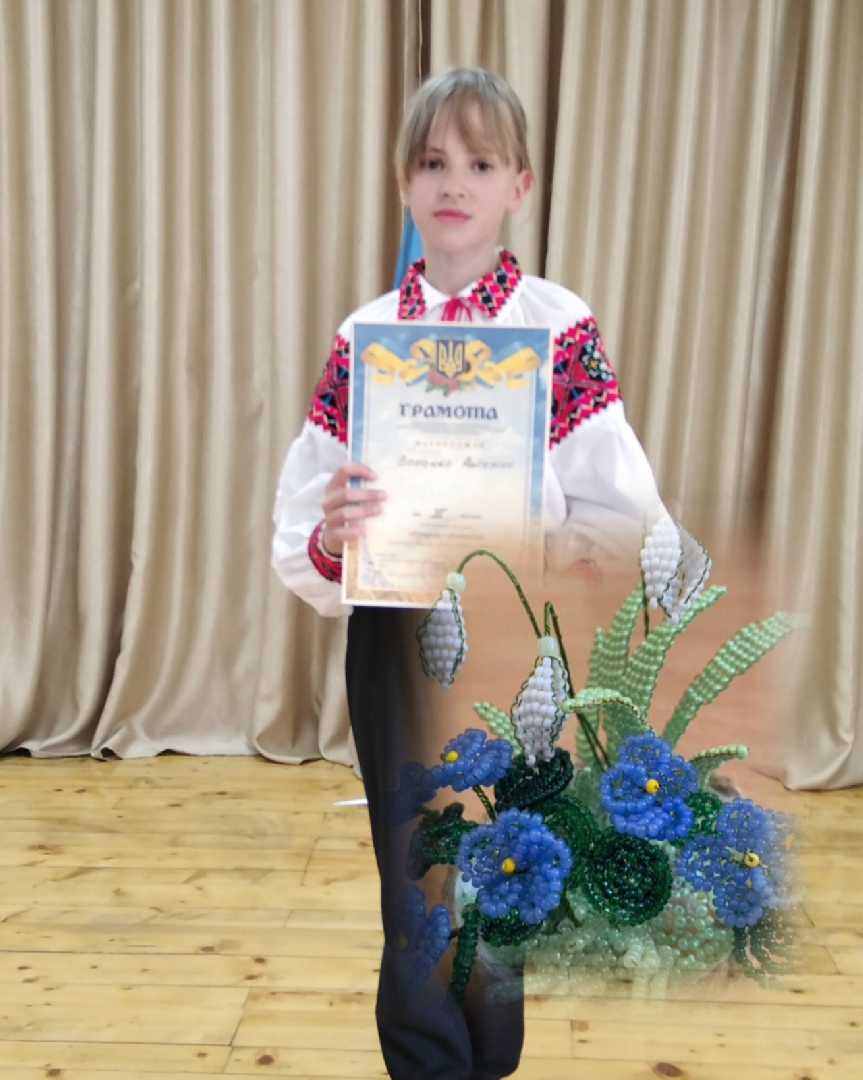 Вітаємо Воронко Ангеліну за зайняте 2 місце в обласному конкурсі "Природа і фантазія" (номінація "вироби з бісперу. квіти , композиції)
