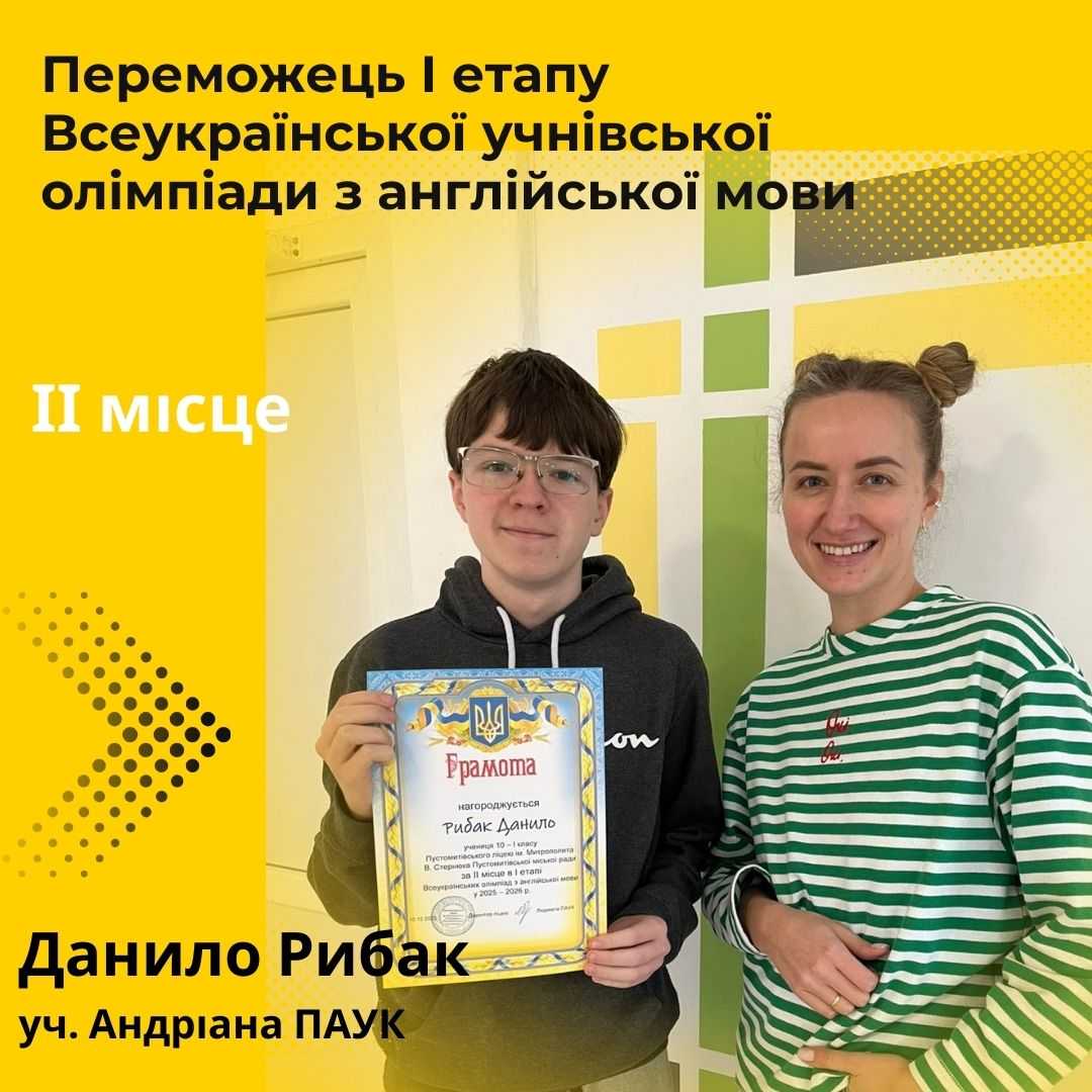 Рибак Данило (10-І клас) — здобув срібну нагороду, посівши 2 місце з англійської мови. Високий пілотаж володіння мовою! (Наставник — Андріана Паук).