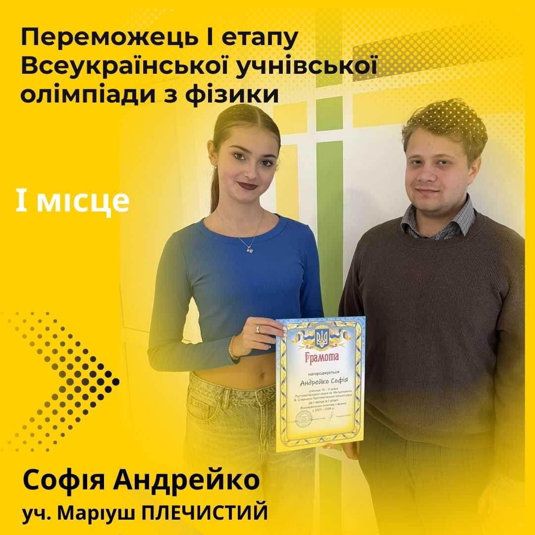 Андрейко Софія (10-У клас) — продемонструвала блискучий результат і посіла 1 місце з фізики. Справжня майстриня точних наук! (Наставник — Маріуш Плечистий).