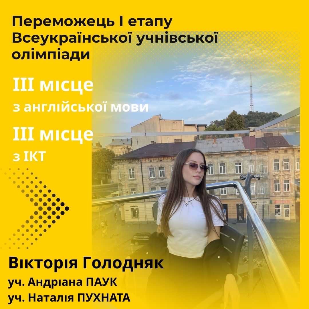 Голодняк Вікторія (10-І клас) — посіла 3 місце з англійської мови, підтвердивши високий рівень лінгвістичної підготовки нашого ліцею. (Наставник — Андріана Паук).