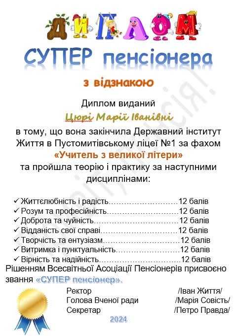 Сотні слів «дякую» не вистачить за 40 років невтомної праці Марії Іванівни Цюри. Вчитель за покликанням! Вчитель з великим серцем! Вчитель-порадник і наставник! За плечима Марії Іванівни більше 35000 уроків, і кожен урок - це віддане серце дітям. Тепер у Марії Іванівни новий етап життя- заслужений відпочинок! Насолоджуйтеся ним сповна, і нехай цей час стане чудовою можливістю для здійснення мрій, на які так не вистачає часу Учителю!
