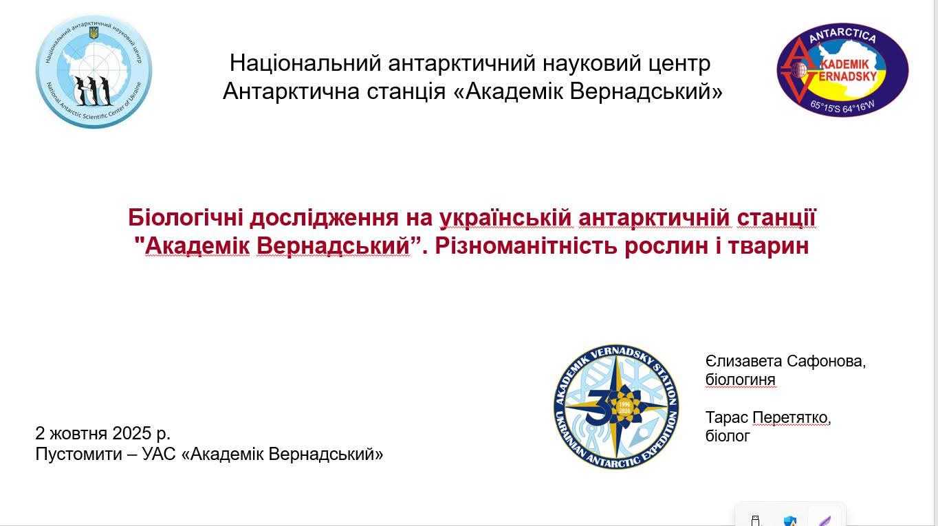 Цікавим видався день 3 жовтня для учнів нашого ліцею №1, адже вчителька біології Оксана Ілик організувала онлайн-зустріч із українськими науковцями, які зараз працюють на станції «Академік Вернадський», розташованій на мисі Марина острова Галіндез, що в Антарктиці. Доцент Львівського національного університету ім. І. Франка біолог Тарас Перетятко та біологиня Єлизавета Сафонова з Інституту морської біології НАН України, учасники 30-ої Української антарктичної експедиції, розповіли учням про флору та фауну такого далекого від України куточка світу, демонструючи фото та відео, відзняті українськими науковцями, провели екскурсію станцією, яка є метеорологічною та геофізичною обсерваторією, показавши її зсередини, познайомили із колегами, вказавши загалом тематику їх досліджень. Діти змогли побачити справжню антарктичну весну та поставити запитання вченим-дослідникам.