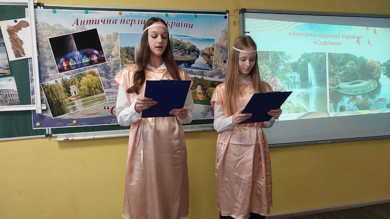 "Антична перлина України"( парк " Софіївка") - захід - літературна вітальня, який відбувся у Пустомитівському ліцеї 1 ( 8- А кл., учитель Вікторія Лутчин) в рамках зібрання професійної спільноти учителів зарубіжної літератури. Інтегрований підхід :зарубіжна література+ мистецтво + український контекст. Мова йшла про прекрасний парк " Софіївку" - зразок гармонії та краси, створений архітектором Людвіком Метцелем та майстрами Уманщини на замовлення магната Станіслава Шенсного Потоцького. Мальовничі пейзажі з гротами, скульптурами, фонтанами, наповнені сюжетами давньогрецьких міфів та славетних епічних поем Гомера - " Іліади" та Одіссеї". Діти розповідали про цікаві місця " Софіївки" - Тарпейську гірку, джерело " Срібні джерельця", фонтан " Змія", павільйон Флори, терасу Муз, Левкадську скелю, Кавказьку гору, Іонічне море, острів Ітаку, ріку Стікс та Ахеронтійське озеро, гроти Каліпсо, Фетіди, Горішок, " Дзеркало Діани", Критський лабіринт, долину гігантів, храм Посейдона, площу Зборів. Цікавою була сценка з міфу " Дедалі та Ікар"( уч.6- А кл. Кордюк М. та Головач М.). Переглянули відео про " Софіївку"(24 канал" Мандруй Україною") та відео з подорожі учителів та учнів Пустомитівського ліцею 1 ще у 2014 році. Вікторина на знання античних афоризмів, перегляд відео грецького танцю сіртакі. Це була своєрідна віртуальна подорож до " Софіївки"- втілення справжнього мистецтва та краси.
