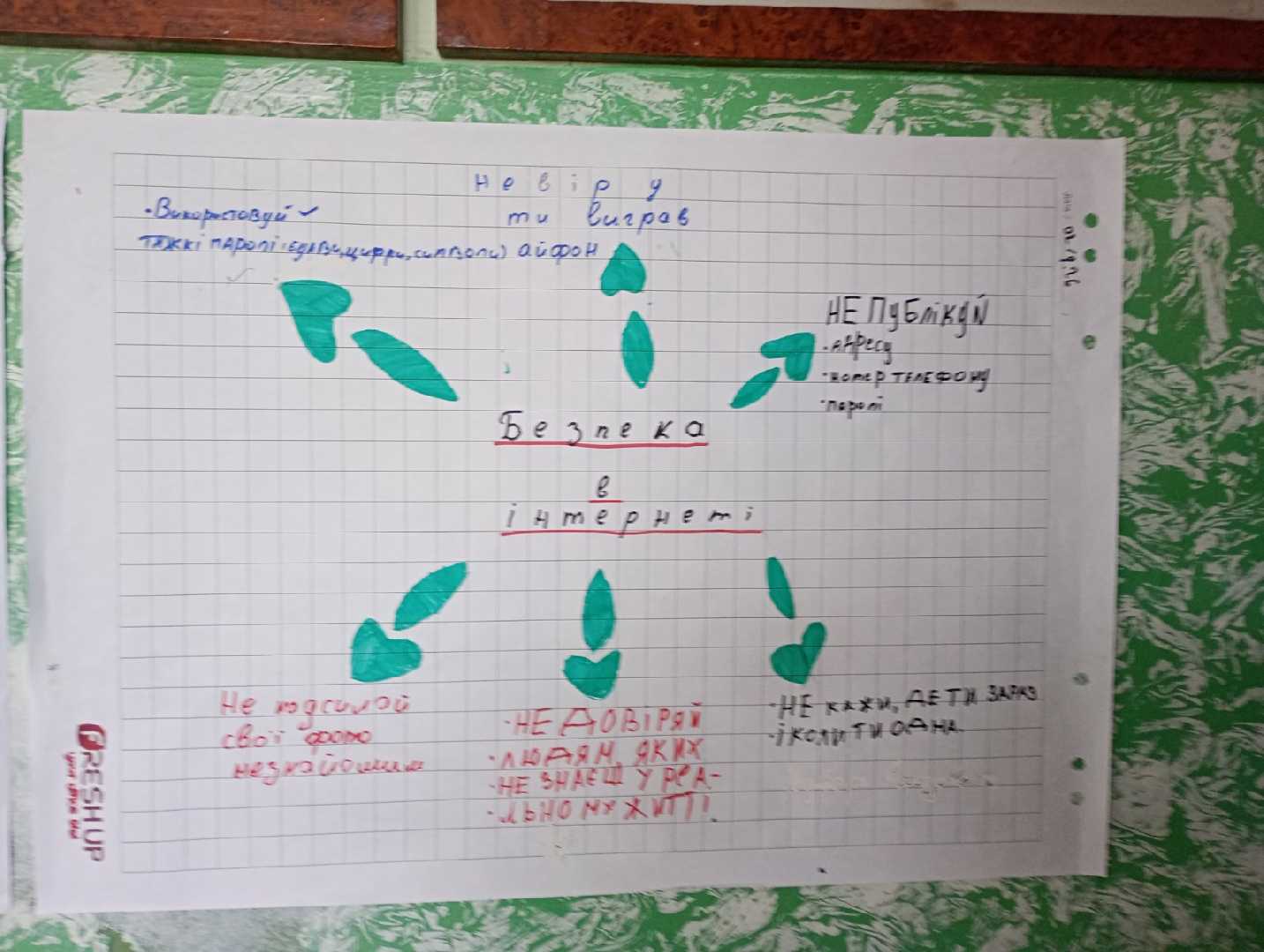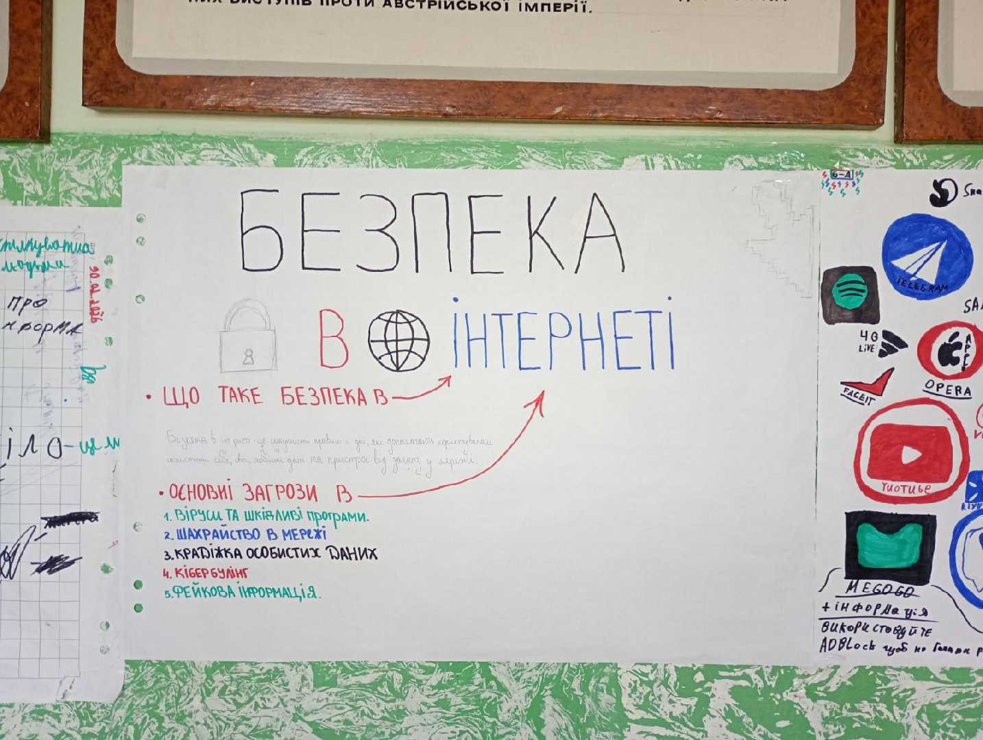 В рамках Тижня безпечного інтернету було проведено вчителями інформатики ряд заходів спрямованих на формування медійної грамотності а саме: антифейкова гра НОТАЄНОТА серед учнів 9 класів, панельна дискусів "Можливості і загрози Інтернету" серед учнів 8 класів, квест "Моє цифрове дзеркало" учнями 7-Б класу, прослухано курс "Шахраї#Гудбай" учнями 5-9 класів та участь закладу в всеукраїнському челенжі "Шахраї#Гудбай".