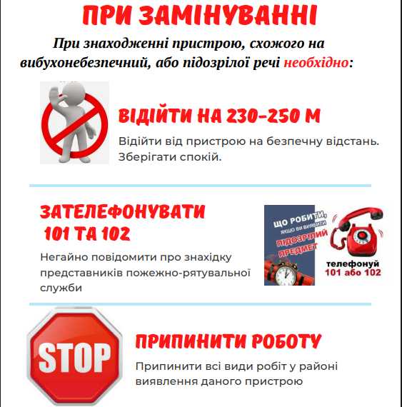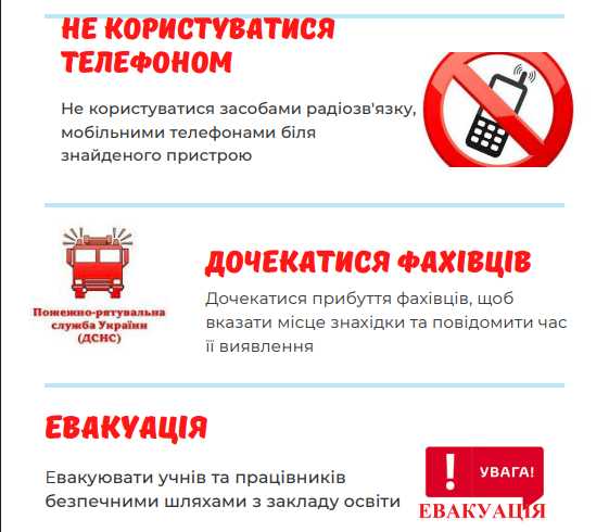У разі замінування навчального закладу від знань і навичок вчителів залежить життя дітей, які у цей час перебувають у будівлі. Евакуація є основним способом захисту в разі загрози або виникнення надзвичайної ситуації. Що робити, якщо до закладу освіти зателефонували та повідомили про замінування: